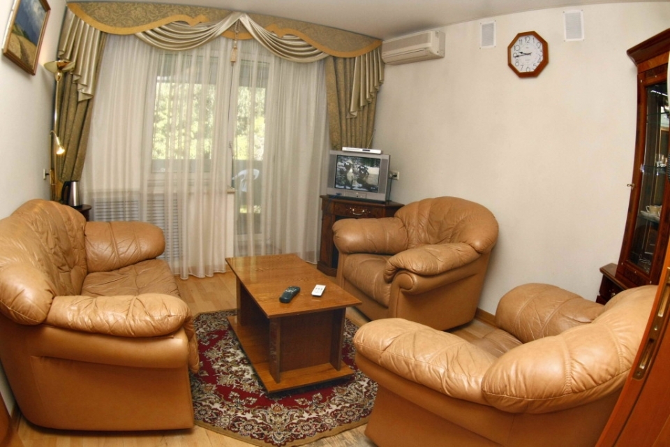 В номере: 1 комната, балкон, холодильник, телевизор, журнальный столик, DVD плеер, телефон, утюг, чайник, столовые приборы, чайная посуда, туалетный столик