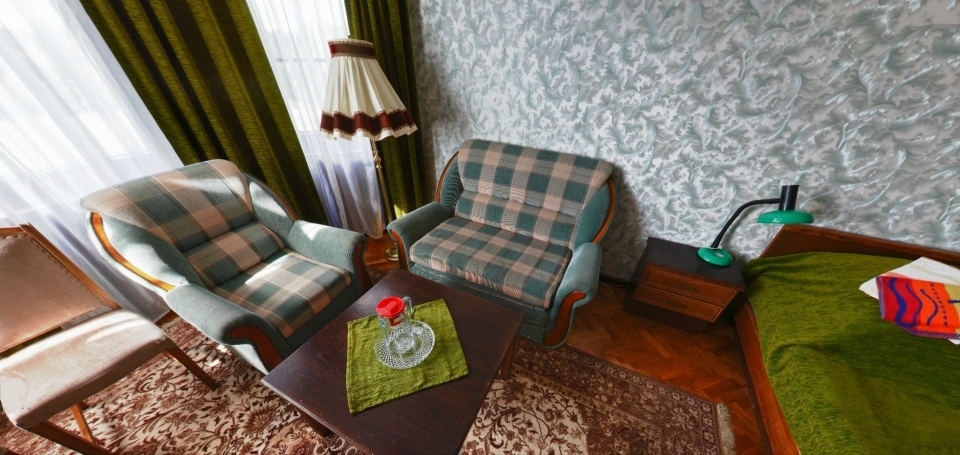 В номере: Кресло, диван, 2 кровати, торшер, шкаф, холодильник, телевизор, телефон, электрочайник.